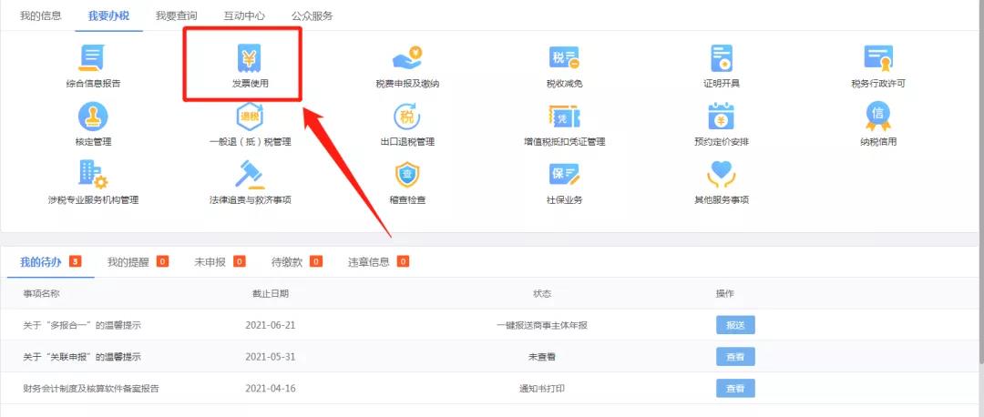 1、登錄深圳市電子稅務(wù)局,點(diǎn)擊首頁“我要辦稅”,選擇“發(fā)票使用”。