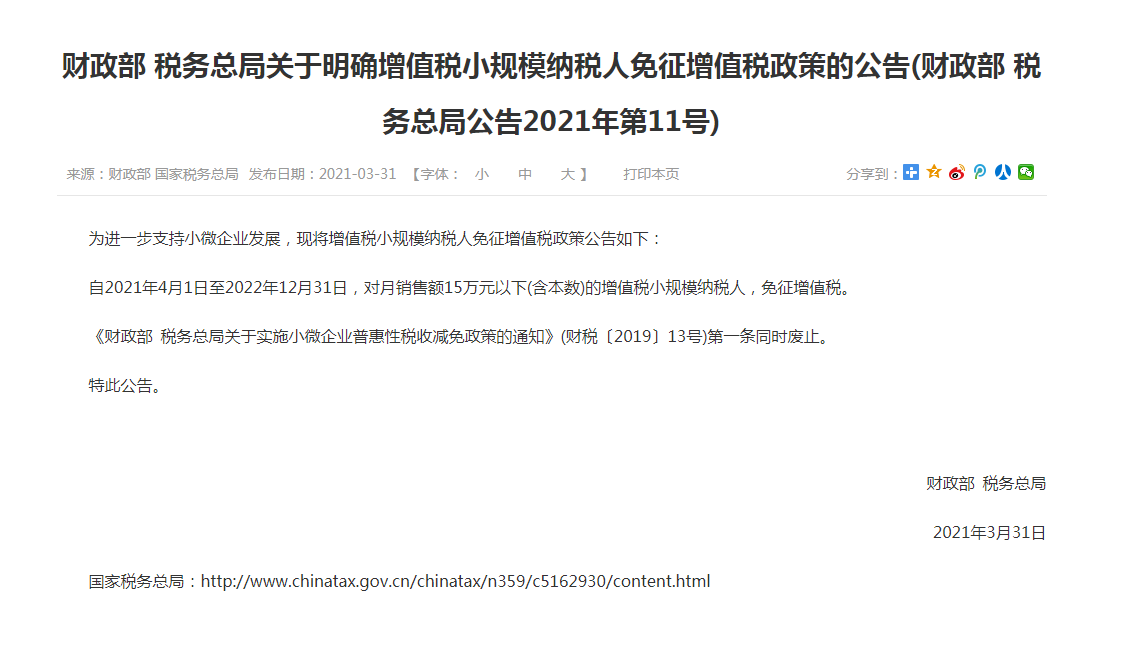 但小規模納稅人還有另外一個政策,月銷售額不超過15萬或季度銷售額不超過45萬,免征增值稅,該項政策持續至2022年12月31日。
